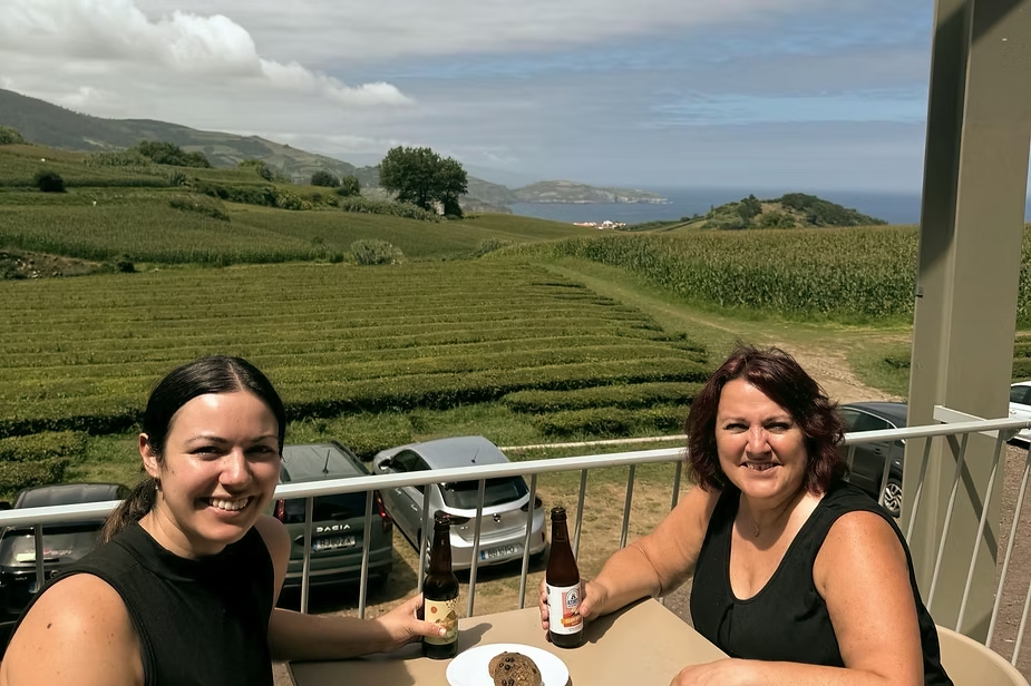 A nossa proprietária, Vanessa, e a sua tia Manuela a saborear uma cerveja local e biscoitos de chá no Chá Gorreana.